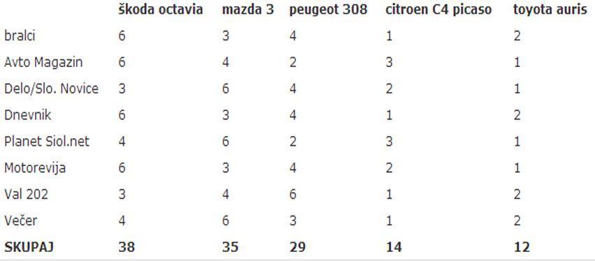 Letošnji naziv “slovenskega vozila leta”, je prvič v 22-letni zgodovini izbora slovenski avtomobil leta, priznanje dobila znamka Škoda. V napetem finalu je Octavia za tri točke premagala Mazdo 3, tretje mesto pa je osvojil Peugeot 3o8.