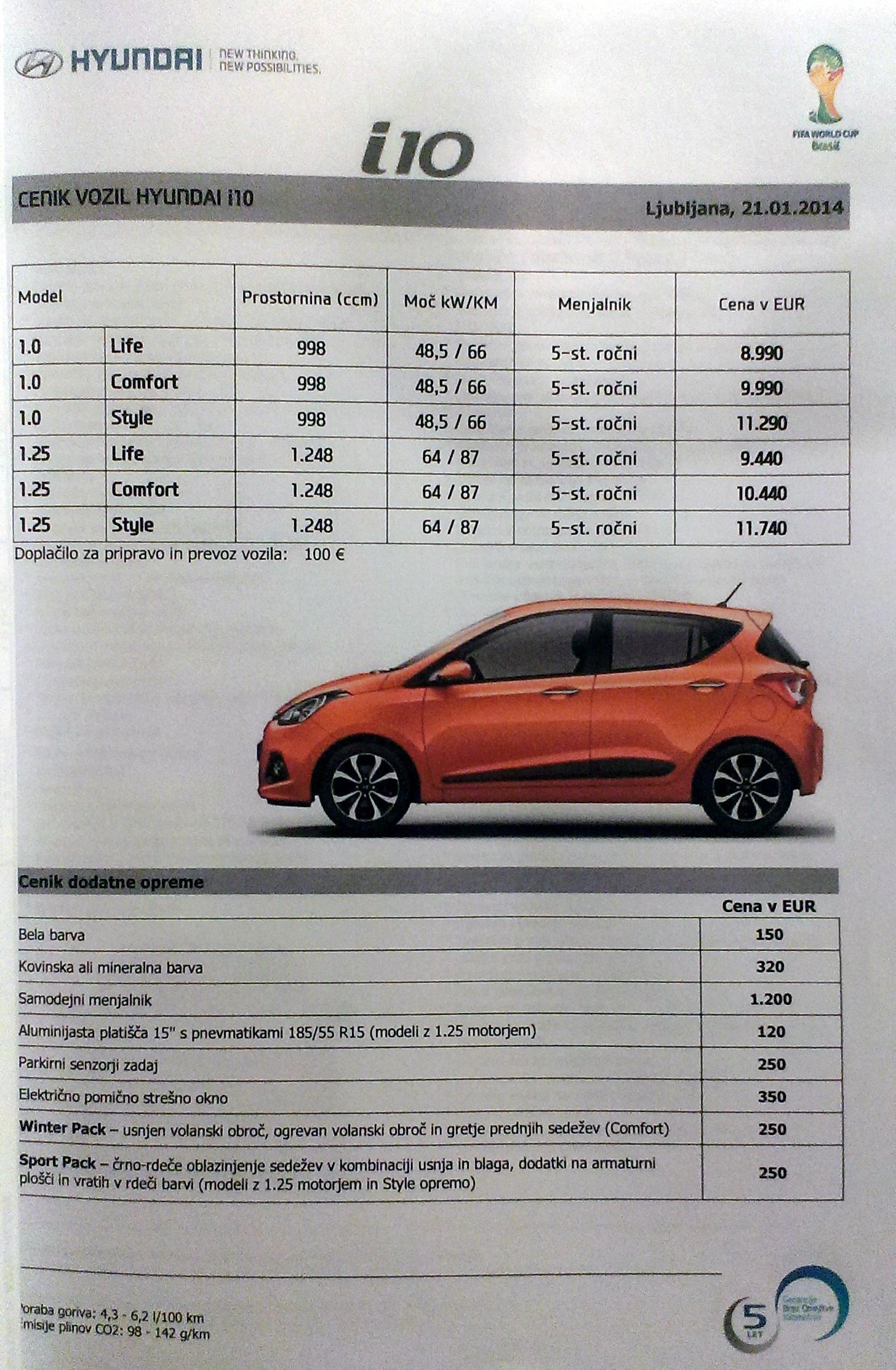 Osnovi model i10, z litrskim motorjem in opremo Life, stane 8.990 evrov. Za najbolje opremljenega i10 z 1,25-litrskim motorjem bo potrebno odšteti 11.740 evrov. Ob nakupu i10 prejmete še 5-letno garancijo brez omejitve kilometrov, 5 let asistence na cesti in 5 let brezplačnih preventivnih pregledov vozila.