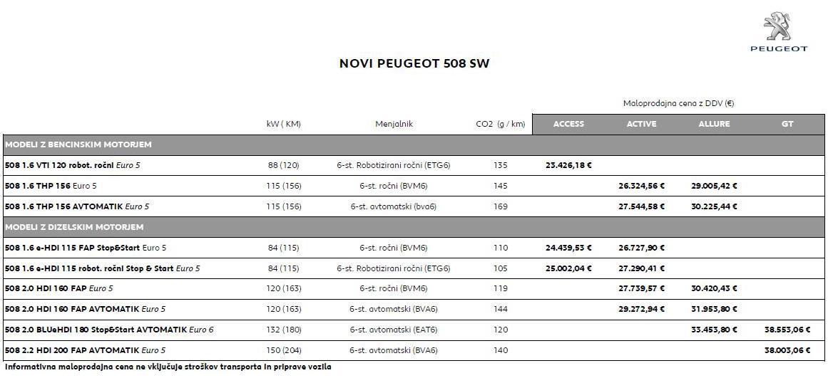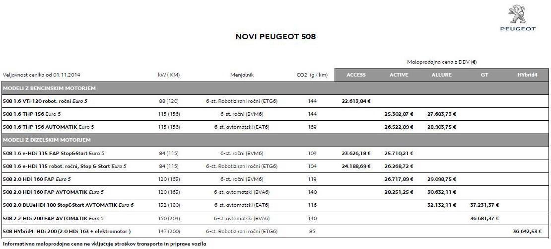 S prenovo so se avtomobili za nekaj sto evrov sicer podražili, vendar hkrati pridobili tudi nekaj opreme. Tako je osnovni limuzinski 508 (1.6 VTi 120) po ceniku na voljo za 22.613 evrov, cenik SW se začne približno za tisočaka višje, cene pa se končajo pri 38.500. Posebnež RXH stane 37.735 evrov, njegova hibridna različica pa 45.228. seveda ob začetku prodaje ponujajo raznovrstne popuste (okoli 15%) in kombinacije z bogatejšo opremo, dodatno pa še podaljšanje garancije na 5 let (100.000 km). Letos računajo na 35 kupcev (15 limuzin, 20 SW) drugo leto pa na 160 (60:100 v korist SW).