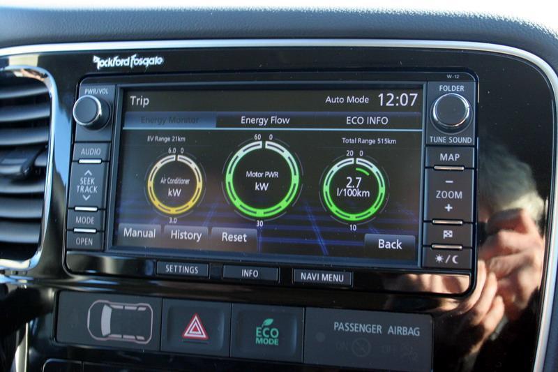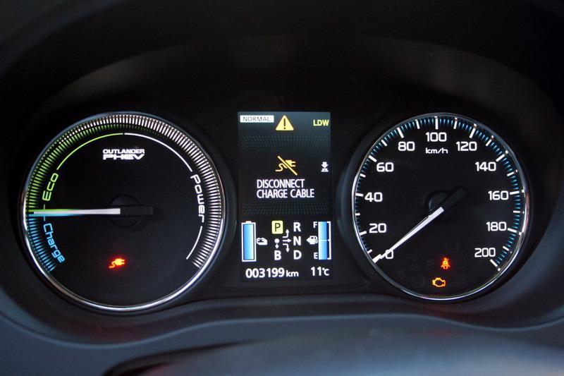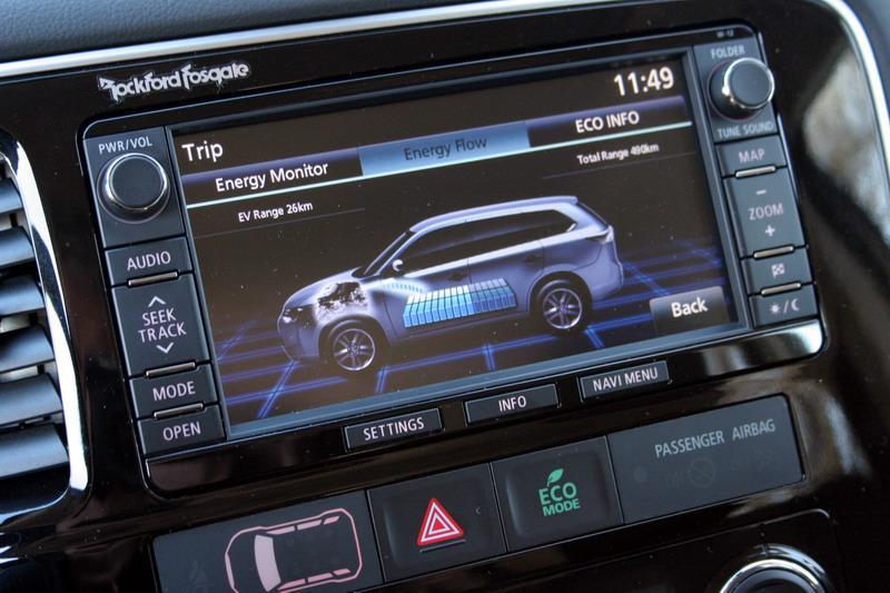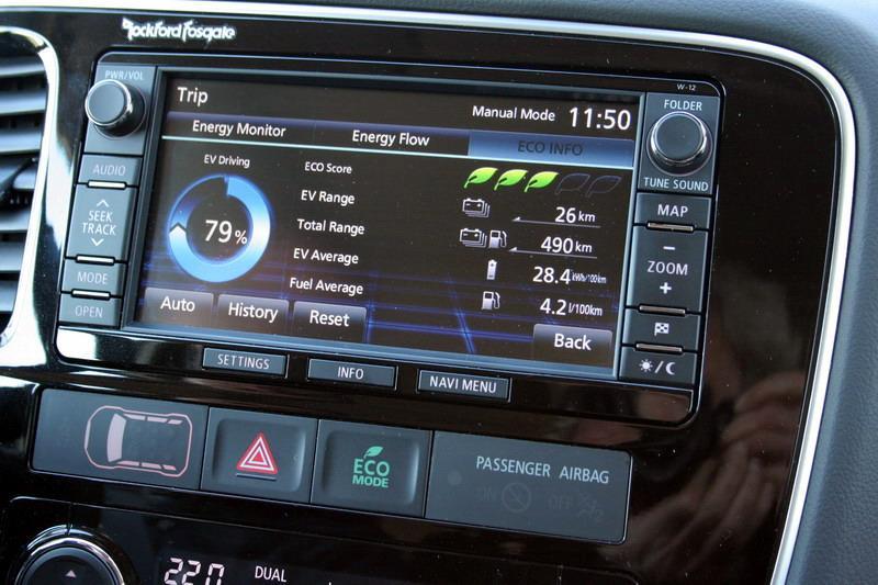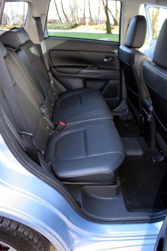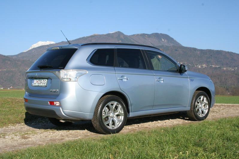 Akumulatorski del je vgrajen pod dno vozila, tako, da praktično prostornost avtomobila ni okrnjena. Razen 4,5 cm višjega sedenja na zadnji klopi in 1,9 cm višjega dna prtljažnika pri Outlanderju PHEV razliko med navadnim in hibridnim vozilom težko opazimo. Prtljažni prostor je zato manjši le za 14 litrov (463 L). Je pa zato hibrid težji za slabih 200 kg. K temu največ doprinese seveda Li-inoski baterijski sklop (300V) s kapaciteto 12 kWh, kar zadošča za normnih 52 km vožnje samo na elektriko. Po raziskavah je to tudi v večini primerov (70 %) dovolj za vsakdanje potrebe. Domet se seveda spreminja tudi glede na režim vožnje, saj se akumulator lahko ne samo prazni, ampak tudi polni med vožnjo (denimo po klancu navzdol ali pri zaviranju). S pritiskom na določen gumb pa porabo elektrike med vožnjo lahko zmanjšamo, oziroma dosežemo prisilno polnjenje tudi ročno. Tako elektriko prihranimo denimo za vožnjo po mestu, ali območjih, ki so omejena samo za promet z vozili na elektriko. Vse več evropskih mest namreč sprejema tudi takšne omejitve. Sicer pa Outlander PHEV lahko vozi samo na elektriko vse do hitrosti 120 km/h.