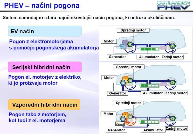 Mitsubishi Outlander PHEV je sicer še ne prinaša. Je pa med tistimi hibridnimi avtomobili, ki menda pomenijo nekakšno prehodno obdobje. In je očitno med tistimi, ki ponujajo najboljšo možno kombinacijo pogonov in energentov. Je eden tistih avtomobilov, ki trenutno ponujajo najboljši kompromis med vsemi možnostmi. Je namreč hibrid z vsemi možnimi kombinacijami delovanja. Deluje lahko tudi kot zaporedni ali vzporedni hibrid. V praksi to pomeni, da deluje lahko samo na električni pogon (najpogosteje – prvih 52 km), samo na bencinski pogon (zelo redko), ali kot kombinacija obeh, bencinski motor pa deluje tudi samo kot generator električne energije. Za pogon ali za polnjenje baterij. PHEV (skrajšano iz Plug-in Hibrid Electrical Vehicle), ali priključni hibrid po slovensko, je torej trenutno edini hibrid, ki ponuja vse možnosti naenkrat.