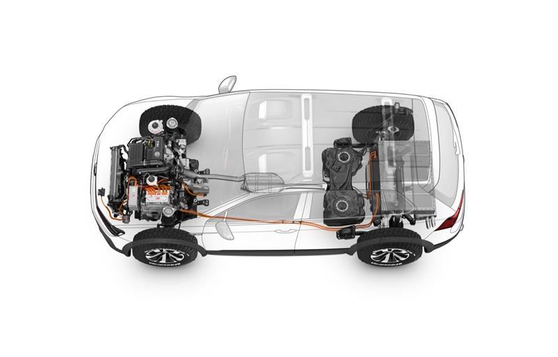 Terenski videz v obliki pravih terenskih gum in ostalih znanih dodatkov je podkrepljen s kombinacijo turbo bencinskega motorja s 110 kW in dveh elektromotorjev s 85 kW, katerima energijo zagotavljajo litij-ionske baterije (12,4 kWh), medtem ko je za prenos zadolžen šeststopenjski DSG menjalnik, ki moč pošilja na vsa štiri kolesa. Skupen doseg znaša 933 km, medtem ko je vožnja na elektriko možna zgolj v dolžini dobrih 30 km.