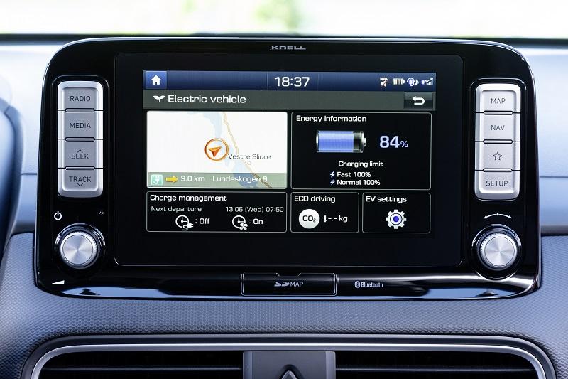 Nasploh je Kona Electric precej dobro založena z najsodobnejšo asistenčno-varnostno ter multimedijsko tehnologijo. Veliko je aktivnih že delno avtonomnih pomočnikov, možnosti povezovanja pametnih naprav in podobnih naprednih rešitev, med drugim tudi projecirni zaslon.