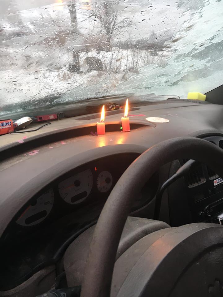 Ko je avto pripeljal bližje pa je šerif opazil, da se voznik problematike neočiščenega stekla zaveda, vendar se očitno sooča s tehničnimi težavami nedelovanja ogrevanja. Voznik avtomobila se je problema lotil tako, da je na vrhu armaturne plošče prižgal dve sveči, ki naj bi ogrevale vetrobransko steklo ter s tem pospešile odtajanje.