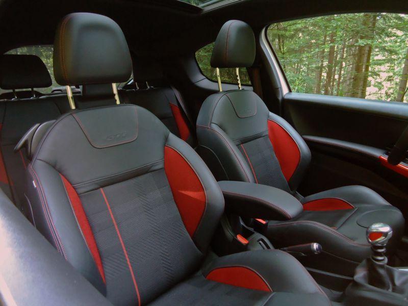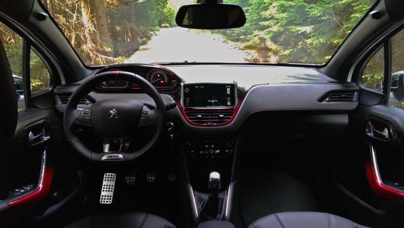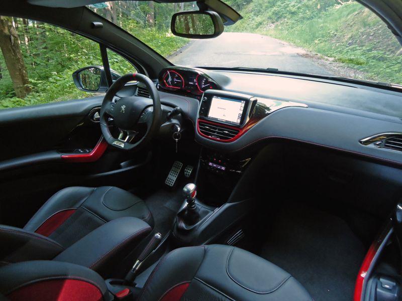 Recepturo zunanjosti so oblikovalci uporabili pri še v potniški kabini. Potniki ne bodo prav nič prikrajšani na račun športnosti. Še več. GTi serijsko ponuja bogat spisek opreme. Sedalne površine so kombinirane z usnjem in alkantaro ter prešite z rdečimi šivi. V stilu sta ukrojena še prestavna manšeta in manšeta ročne zavore. Armaturna plošča je odeta v usnje in zaključena z rdečimi šivi. Volanski obroč je še za odtenek manjši kot pri navadnem 208, odebeljen in šivan prav tako z rdečimi šivi. Stropna obloga je športne črne barve. Dodatno je testno vozilo ponujalo še panoramsko streho, ki je ob jasnih večerih, pričaralo romantično vzdušje ob modrih LED diodah.