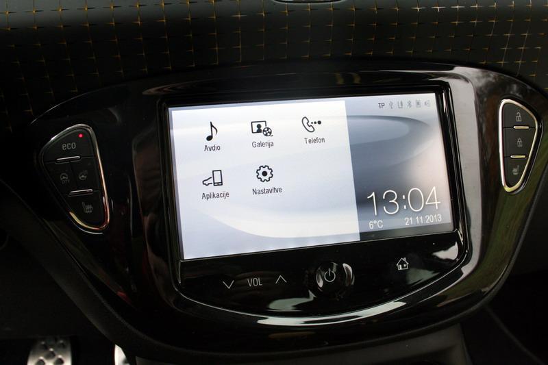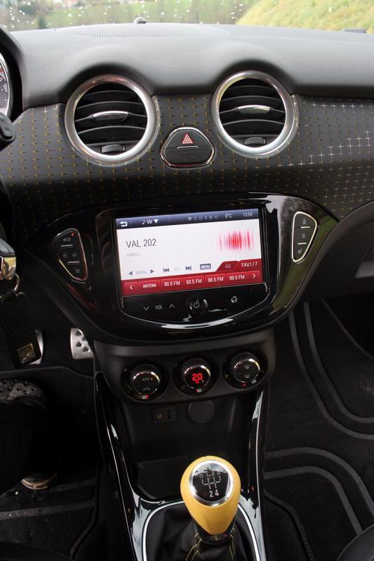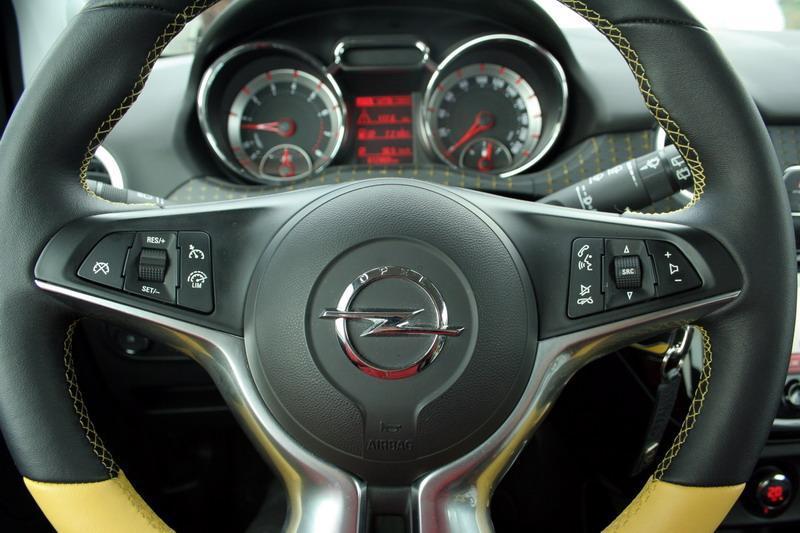Testni Adam je recimo imel ogrevana prednja sedeža in volanski obroč, v meniju prikazanem v velikem barvnem LCD zaslonu na vrhu sredinske konzole, pa možnost izbire nešteto individulanih nastavitev. Poleg radijskega sprejemnika je tu potovalni računalnik z obilico podatkov, vključno s statistiko varčnosti, le navaditi se bo treba, da »stikala na dotik« včasih ne reagirajo takoj, kot bi pričakovali. Z gumbom na stropu lahko spreminjamo barvne odtenke  notranje osvetlitve. Opremili so ga tudi z ogromnimi, kar 18 palčnimi platišči in temu primernimi nizkopresečnimi gumami (35!).