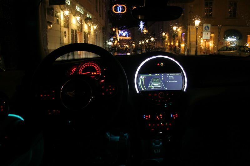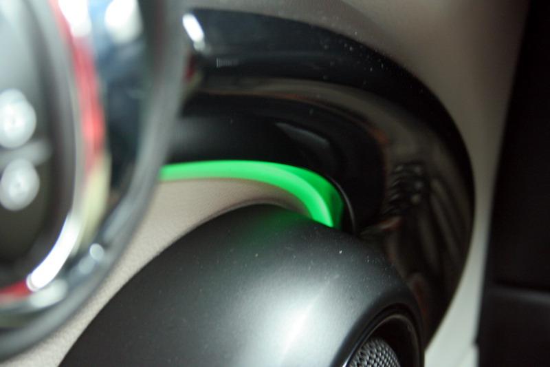 Število stikal in razporeditev je še vedno malce futuristična, včasih so temu rekli letalska. Nekako izstopa tisti rdeče osvetljeni vzvod za zagon motorja, marsikoga pa bo verjetno presenetila tudi izbira različnih barvnih možnosti osvetlitev, tako notranjosti kot nekaterih opozoril. Na motorne vrtljaje lahko opozarja velik svetleči obroč okoli okroglega zaslona, različni barvni vzorci pa z različno jakostjo svetijo tudi, ko vrtite določene gumbe.